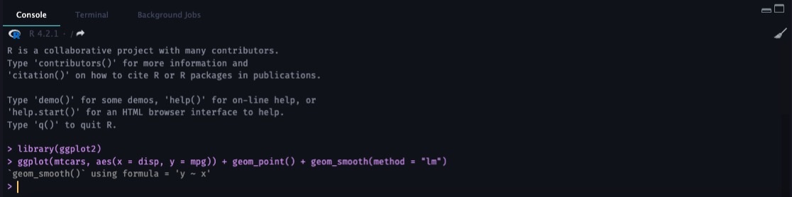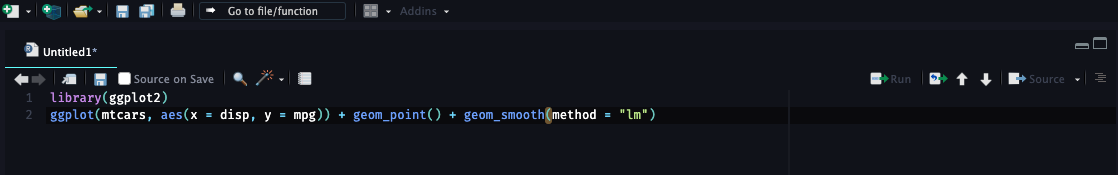ggplot2함수를 사용하기 전에library("ggplot2")로ggplot2패키지를 로드합니다. 그 이후에 다음과 같은 함수를 실행할 수 있게 됩니다:ggplot(mtcars, aes(x = disp, y = mpg)) + geom_point() + geom_smooth(method = "lm")