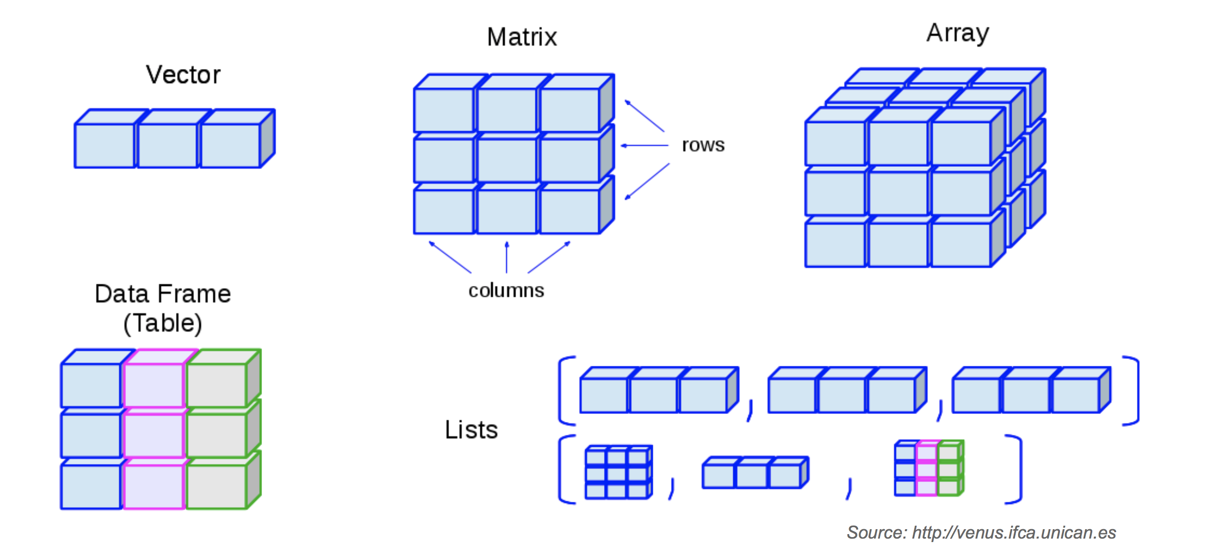R에는 기본적인 데이터 구조가 있습니다.다른 거의 모든 객체는 기본적인 데이터 구조를 기반으로 구축됩니다.