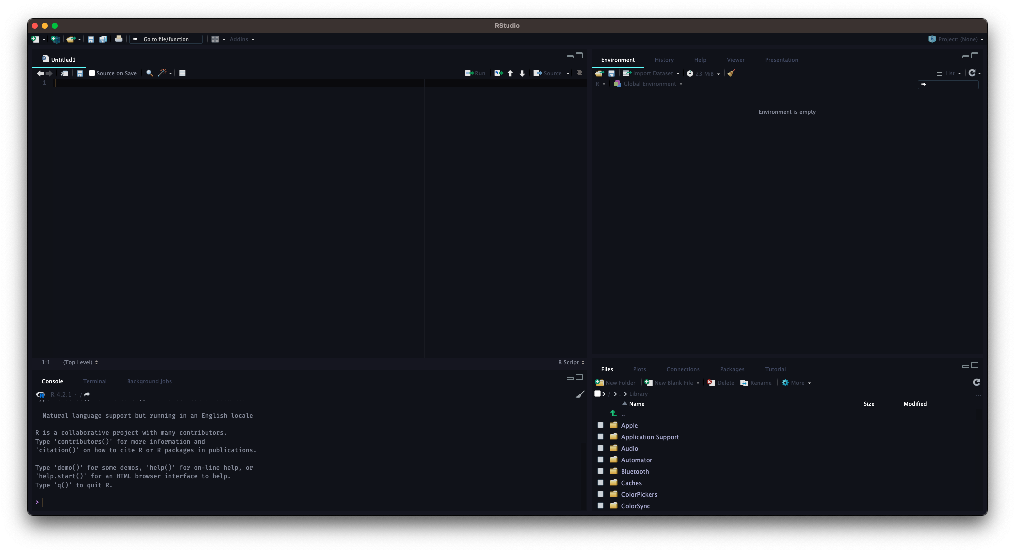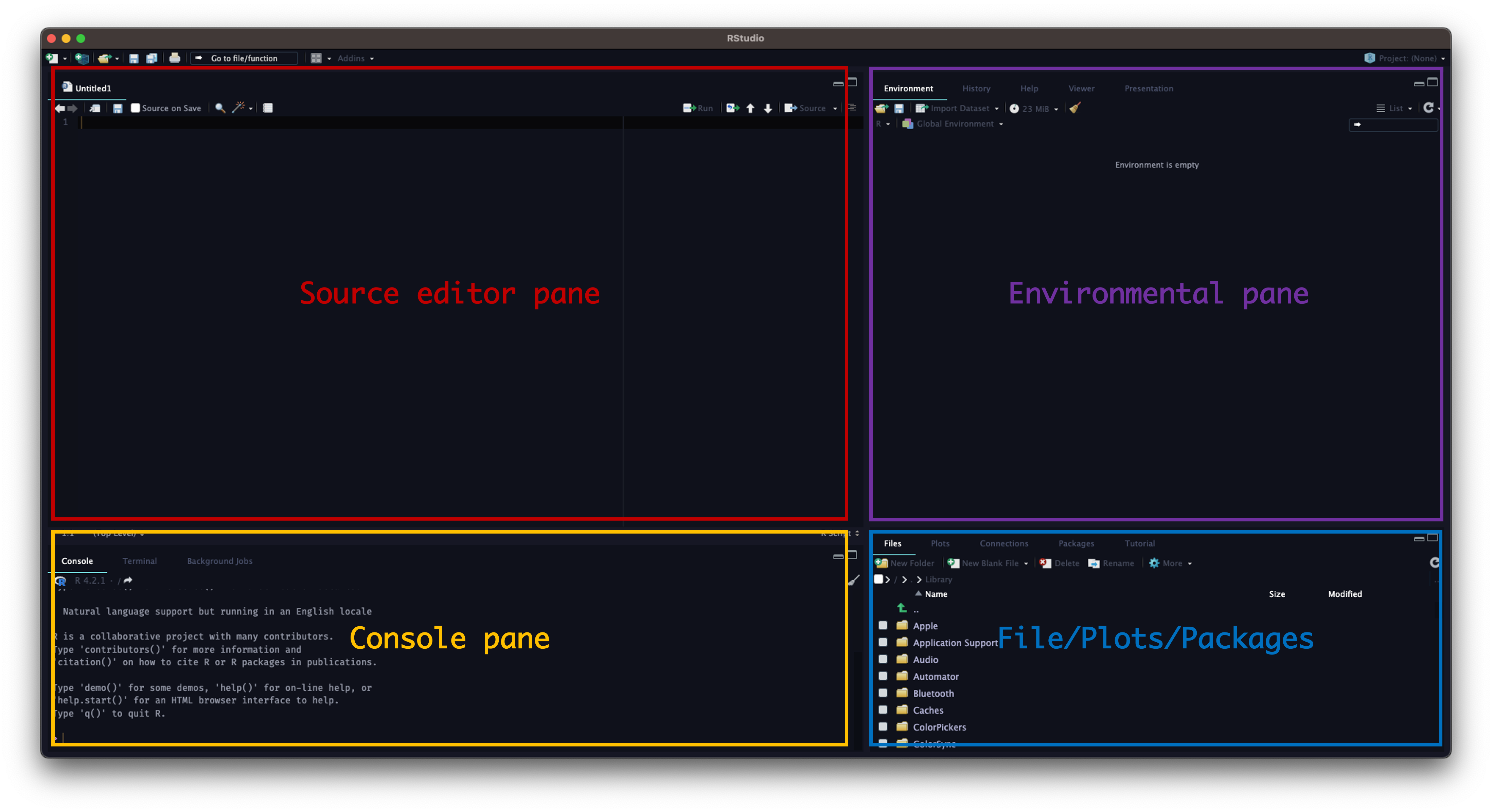 R 및 RStudio (POSIT)를 성공적으로 설치했으면 RStudio를 시작해봅시다. 다음과 같은 화면이 표시될 것입니다. 다시 한 번 말씀드리지만, RStudio는 R을 위한 편리한 인터페이스(또는 IDE)이므로 R이 아닌 RStudio만 실행하면 됩니다.